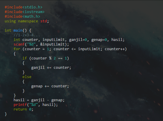 Bisa dilihat bahwa kita mengelompokkan ganjil dan genap terlebih dahulu lalu mengurangkan ganjil dengan genap karena ganjil menjadi angka pertama. Hasil dari deret tersebut selalu berpola setengah dari nilai maksimum/yang diinput. Jika genap maka hasilnya minus setengah dari nilai input. Sedangkan jika ganjil maka hasilnya adalah positif setengah dari nilai tersebut dengan pembulatan ke atas.