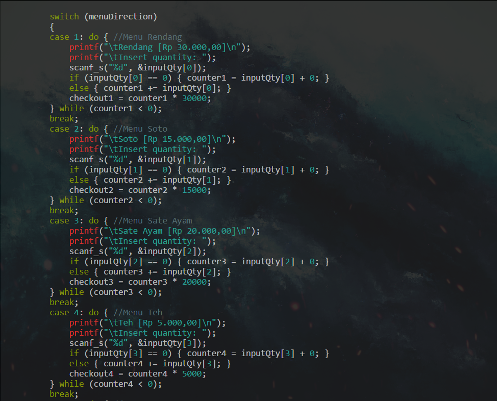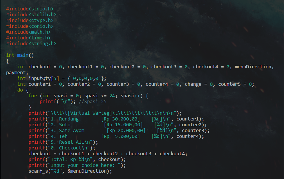 Hari ini kita akan membuat sebuah program yang cukup panjang (menurut author ketika menulis ini). Kita akan membuat sebuah program yang berjudul "Virtual Warteg". Program ini adalah program untuk mesin kasir yang menampilkan menu makanan dan jumlah uang yang harus dibayarkan pelanggan. Berikut adalah kodenya: