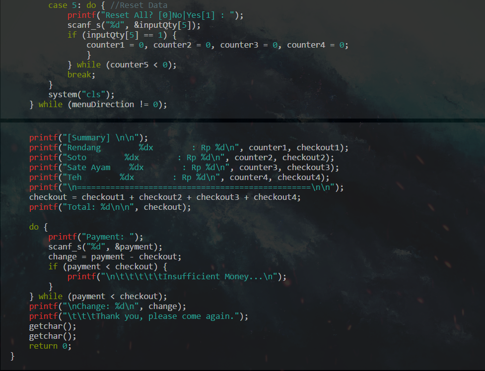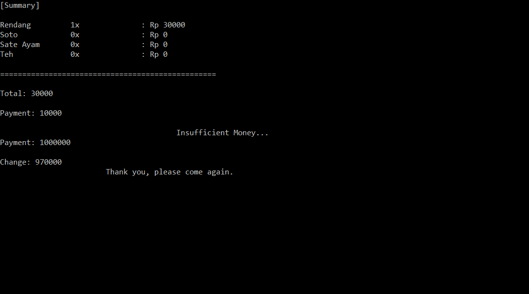 Program ini merupakan prototype dari aplikasi "Virtual Warteg" yang dikembangkan oleh author. Secara tampillan User Interface, masih kurang bagus dalam format teksnya. Program ini masih kurang efektif karena author membuat variabel-variabel terpisah yang seharusnya dijadikan 1 variabel array saja (checkoutn dan countern). Tetapi secara keseluruhan sudah mencapai syarat dasar dalam mesin kasir. Kedepannya author akan membuat program ini lebih baik dan tentunya menambahkan fitur-fitur canggih seperti pemilik warteg dapat mengupdate ketersediaan barang tersebut sehingga pelanggan dapat memilih makanan yang masih ada saja.