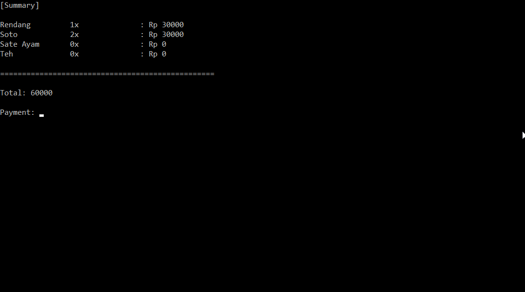 2. Jika dipilih 1/2/3/4 akan muncul menu baru yang meminta input dari user mengenai jumlah makanan yang akan dipesan;
